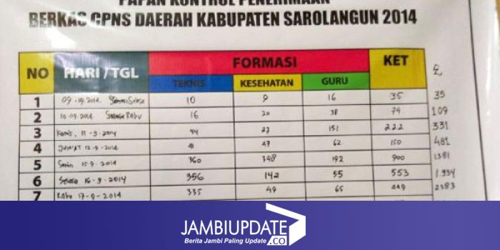 Dari data yang didapat dari BKP2D Kabupaten Sarolangun untuk formasi Tenaga Teknis yang terbanyak, sebanyak 1947 pendaftar, formasi Kesehatan sebanyak 725 pendaftar, dan formasi guru yang paling sedikit pendaftarnya sebanyak 693 pendaftar.