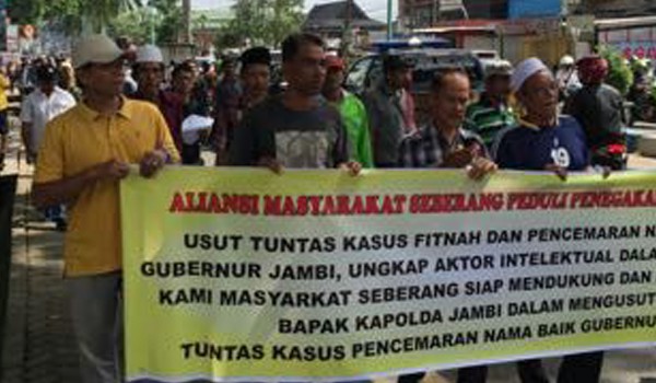 Puluhan masa demo ini meminta pihak Polda Jambi untuk mengusut tuntas kasus penyebaran selebaran gelap yang menghina Gubernur Jambi, Hasan Basri Agus (HBA) dan Isterinya, Yusniana.