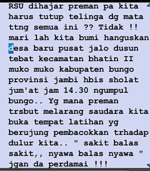 JAMBIUPDATE.COM, BUNGO-Isu prnyerangan yang bakal dilakukan oleh  Pesilat Setia Hati  terhadap warga Dusun Jalo beredar luas via BBM.