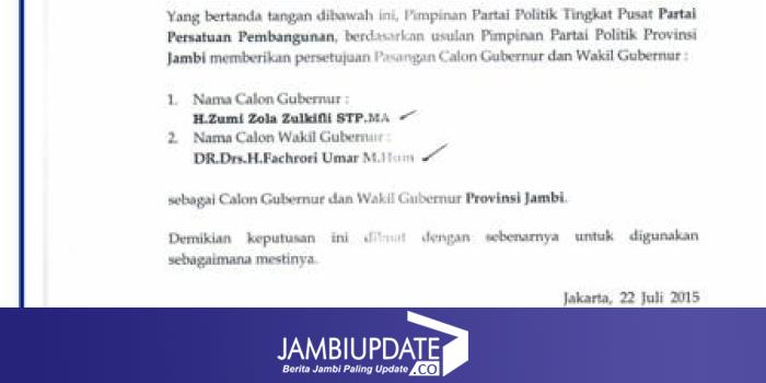 Dalam rekomendasi yang juga diterima jambiupdate.com, tertera dengan jelas tanda tangan Ketum DPP PPP Djan Farid dan Sekjend Dimyati.