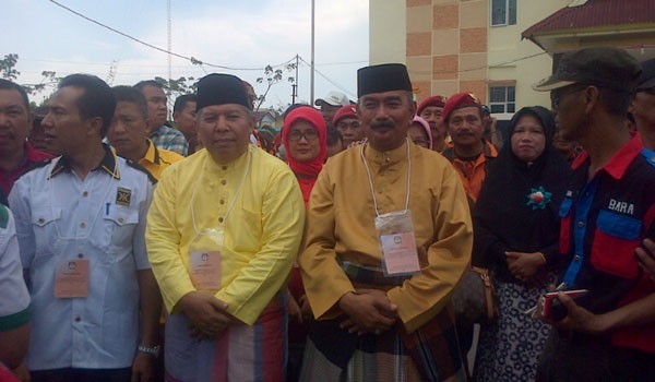 Dengan berjalan kaki kedua pasangan ini diarak dari posko pemenangan dijalan sri soedewi.