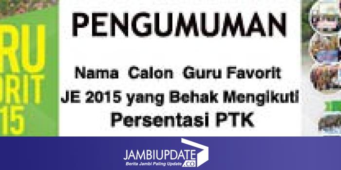 JAMBIUPDATE.COM, JAMBI - Kompetisi Guru Favorit Jambi Ekspres 2015 Road to China memasuki babak baru. Panitia secara resmi mengumumkan nama-nama calon Guru Favorit Jambi Ekspres 2015 yang dipanggil mengikuti persentasi Penelitian Tindakan Kelas (PTK) di Jambi.