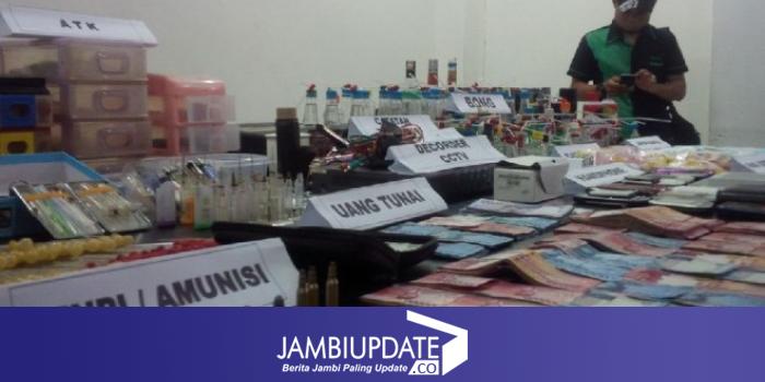 JAMBIUPDATE.COM, JAMBI - Selain mengamankan CCTV dan puluhan Senjata Tajam, Polda Jambi juga menyita uang tunai puluhan juta. Tidak hanya itu, Satu pucuk Senjata Api dan 6 peluru aktif juga disita. Ini merupakan hasil penggerebekan Pulau Pandan, Kecamatan Telanaipura, Kota Jambi, Sabtu (1/8) malam.