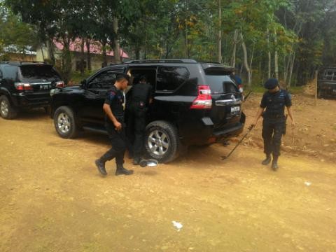 JAMBIUPDATE.COM, SAROLANGUN- Untuk menjaga hal-hal yang tidak dinginkan, lima orang dari anggota Brimob mensterilkan mobil-mobil yang akan ikut iring-iringan mobil Presiden RI Ir Joko Widodo.
