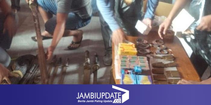 Ada amunisi yang kita amankan dari penggeledahan. Ditambah pedang Besar 4, sedang 4, dan kecil 7. Untuk Senpi tadi lebih dulu diamankan gabungan Polda Jambi dan Polresta Palembang, ujar Wakapolresta Jambi, AKBP Yudha, kepada wartawan.