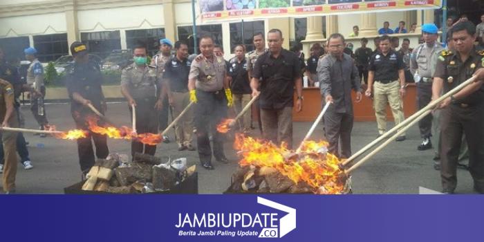 JAMBIUPATE.CO, JAMBI - Polda Jambi siang ini (15/11) memusnahkan puluhan ganja kering. Pemusnahan dilakukan dengan cara dibakar di lapangan hitam Polda Jambi.