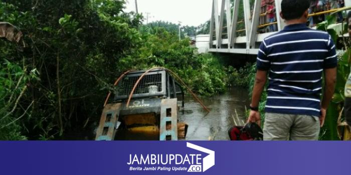 JAMBIUPDATE.CO, BATANGHARI Tronton BH 8905 ML yang bermuatan alat berat berjenis doser terperosok ke dalam sungai yang berada tepat di dekat jembatan peneradan, Desa Rantau Puri Kecamatan Muara Bulian, Kabupaten Batanghari.