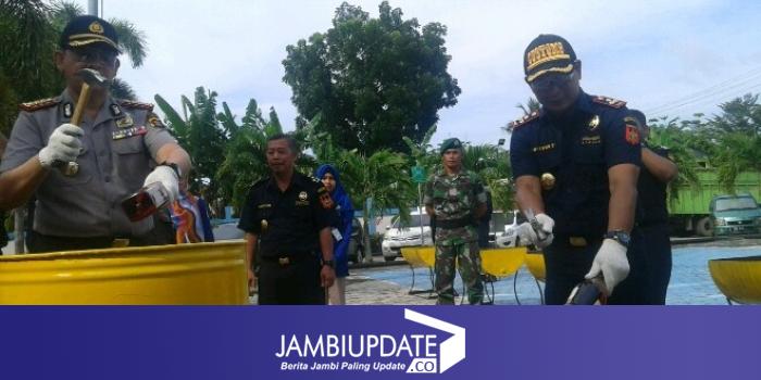 JAMBIUPDATE.CO, JAMBI - Memusnahkan barang bukti merupakan langkah dari Kantor Pelayanan dan Pengawansan Bea Cukai Tipe Madya B (KPPBC TMP B) Jambi, dalam menghindari penyalahgunaan dari oknum yang tidak bertangung jawab.