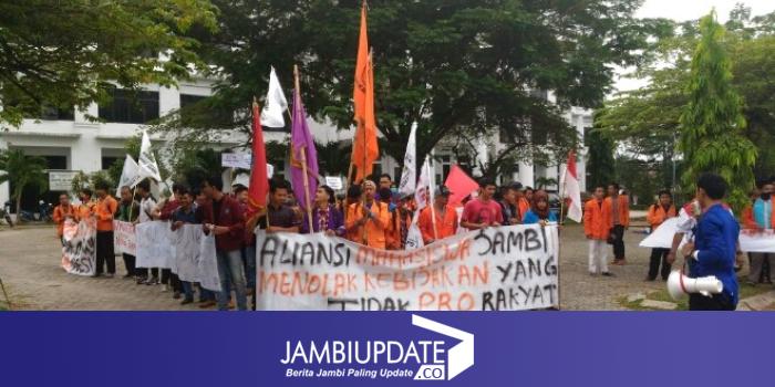 JAMBIUPDATE.CO,JAMBI - Puluhan mahasiswa yang terhubung dalam aliansi mahasiswa menolak kebijakan yang tidak pro rakyat, Kamis (12/1) siang turun ke jalan menggelar aksi unjuk rasa.
