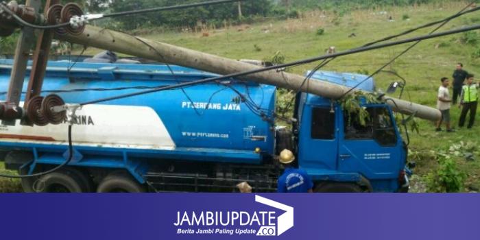 Terlihat mobil tangki menabrak tiang listrik.