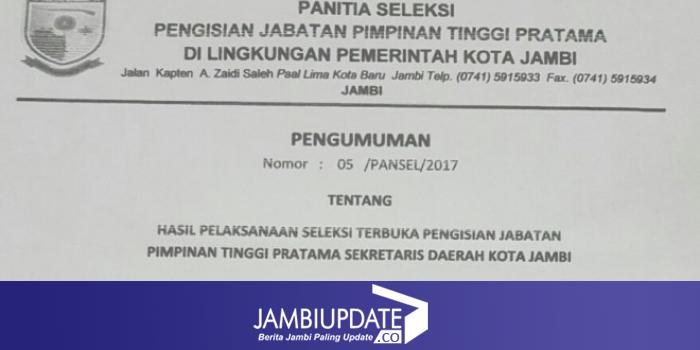 JAMBIUPDATE.CO, JAMBI - Proses seleksi lelang jabatan Sekda Kota Jambi memasuki babak akhir. Nama tiga besar hasil seleksi sudah didapatkan. Hasil tersebut dikeluarkan oleh Pansel tertanggal 19 September 2017.