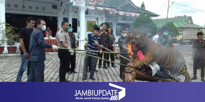 JAMBIUPDATE.CO, SAROLANGUN - Untuk menghindari hal- hal yang tidak di inginkan, Kapolres Sarolangun AKBP Dadan Wira Laksana dan Ikhwan Nul Hakim Kepala Kejaksaan Negeri (Kejari) Sarolangun yang di dampingi oleh unsur Forkompinda lainnya, membakar satu ekor harimau yang sudah di opset, kamis (9/11) sekitar pukul 11.00 wib.