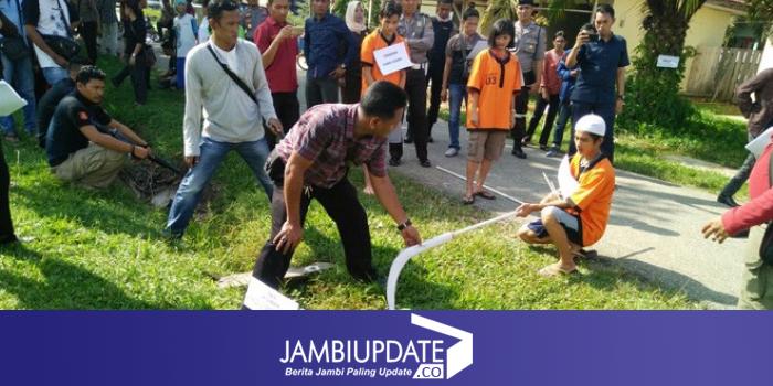 Pihak Reskrim Polres Tebo menggelar reka ulang dihalaman belakang Polres Tebo yang langsung dihadiri oleh Kapolres Tebo AKBP Budi Rachmad.