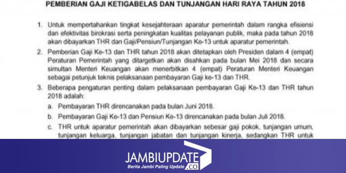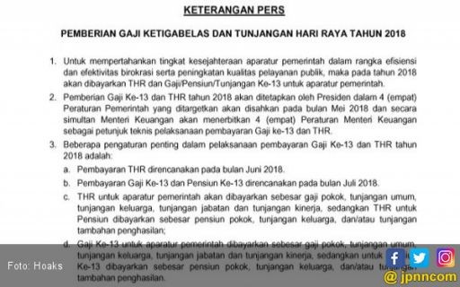JAMBIUPDATE.CO, JAKARTA - Beredar dokumen press release dari Kementerian Keuangan (Kemenkeu) tentang pemberian gaji ke-13 PNS dan tunjangan hari raya (THR) 2018. Dokumen itu membuat banyak PNS gembira sebelum akhirnya kecele.