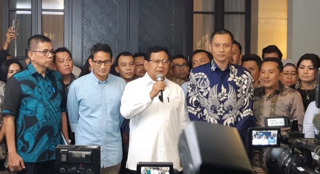 Kami di sini adalah hanya untuk melaksanakan tugas yang saudara-suadara dan rakyat-rakyat indonesia berikan kepada kami. Jangan melihat kami hanya sebagai dua orang saja, lihat yang di belakang kami, di belakang kami adalah suatu rombongan, suatu tim dan secara alamiah, secara rasional dan terencana untuk berkumpul serta bergerak dengan hati yang ingin Indonesia itu makmur, Indonesia adil dan makmur itu, tidak ada lain, ujar Prabowo dalam pidatonya di Soneta Record, Depok, Minggu (28/10) .