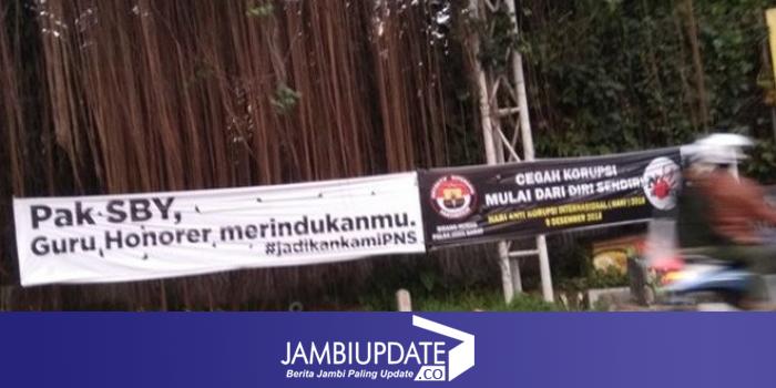 JAMBIUPDATE.CO, BOGOR - Spanduk bertuliskan Pak SBY, Guru Honorer Merindukanmu, #jadikankamiPNS", tampak di wilayah Puncak, Kabupaten Bogor. Spanduk ini dipasang di pinggir jalan sehingga dengan mudah terbaca masyarakat yang melintasi jalan tersebut.