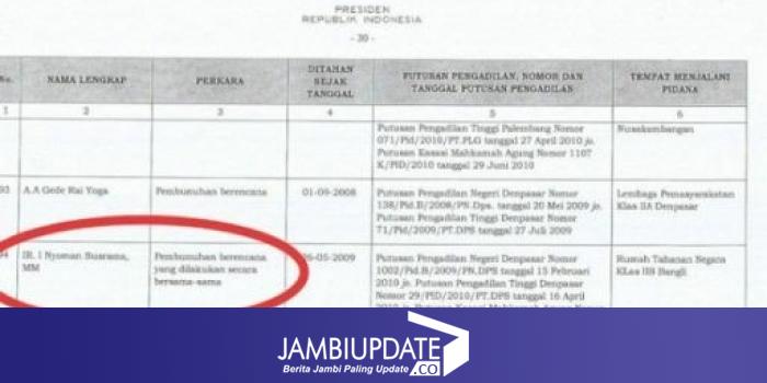 Pokok perkaranya adalah pembunuhan berencana. Surat itu juga mencantumkan sejumlah vonis pengadilan bagi Susrama, antara lain putusan PN Denpasar Nomor: 1002/Pid.B/2009/PN.DPS/ tanggal 15 Februari 2010 juncto putusan PT Denpasar Nomor 29/PID/2010/PT.DPS tanggal 16 April 2010 juncto putusan Kasasi MA Nomor 1665K/PID/2010 tanggal 24 September 2010.(rb/pra/san/mus/JPR)