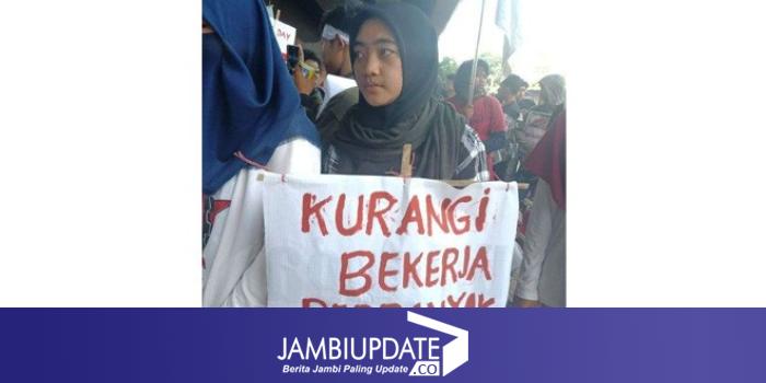 Spanduk itu dipegang seorang demonstran perempuan yang mengenakan kemeja kotak-kotak hitam dipadu jilbab hitam.
