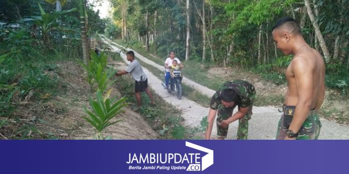 JAMBIUPDATE.CO, JAMBI - Anggota Satgas TMMD Reguler ke 105 Kodim 0415/Batanghari membantu Karno (50) warga Desa Ladang Peris sekaligus orang tua asuhnya membuat pagar rumah di sela-sela waktu istirahat mengerjakan program fisik TMMD.
