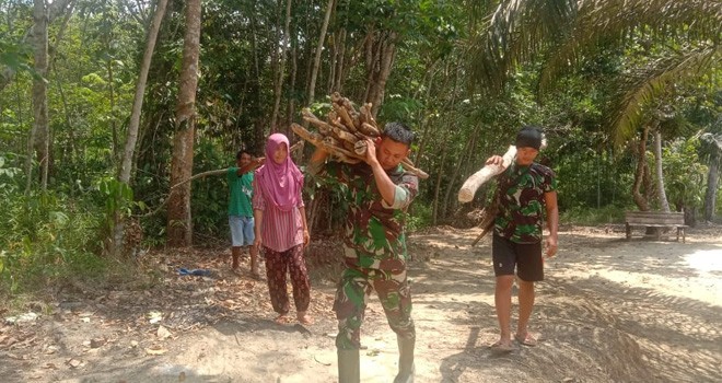 Seperti yang dilakukan oleh Prada Haris salah satu anggota Satuan Tugas (Satgas) TNI Manunggal Membangun Desa (TMMD). Dia dengan penuh rasa ikhlas membantu Trisnowati dan Sadun mencari dan membawa kayu bakar.