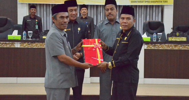 Usai menyampaikan sambutan, Wabup juga menyerahkan secara simbolis menyerahkan berkas Nota Pengantar 7 Ranperda Tebo Tahun 2019 yang diterima langsung oleh Ketua DPRD Tebo, Mazlan, S.Kom bersama Wakil Ketua DPRD Tebo, Aivandri dan Syamsu Rizal.(bjg)