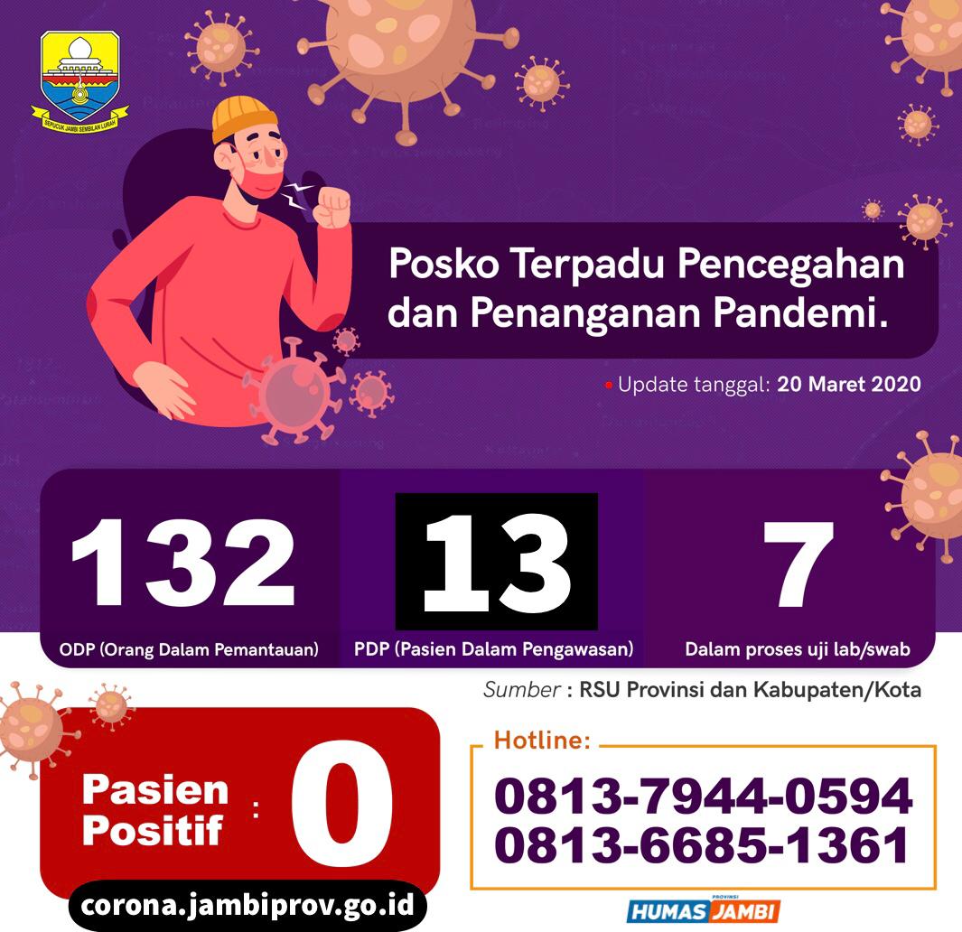 Trend Jumlah Orang Dalam Pemantauan (ODP) meningkat dari 13 menjadi 132, Pasien Dengan Pengawasan (PDP) 11 orang (pada Jumat, 20 Maret 2020), dan uji laboratorium 7. Melonjaknya jumlah ODP setelah Dinas Kesehatan Kabupaten dan Kota telah menyamapaikan data ke Dinas Kesehatan Provinsi Jambi.