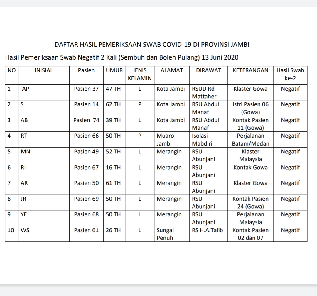 JAMBIUPDATE.CO, JAMBI - Juru bicara gugus tugas Covid19 Provinsi Jambi Johansyah mengumumkan penambahan 10 pasien sembuh. Yang terbanyak berasal dari Merangin 5 orang, kemudian 3 dari Kota Jambi, dan masing-masing 1 sembuh dari Kota Jambi dan Sungai Penuh.