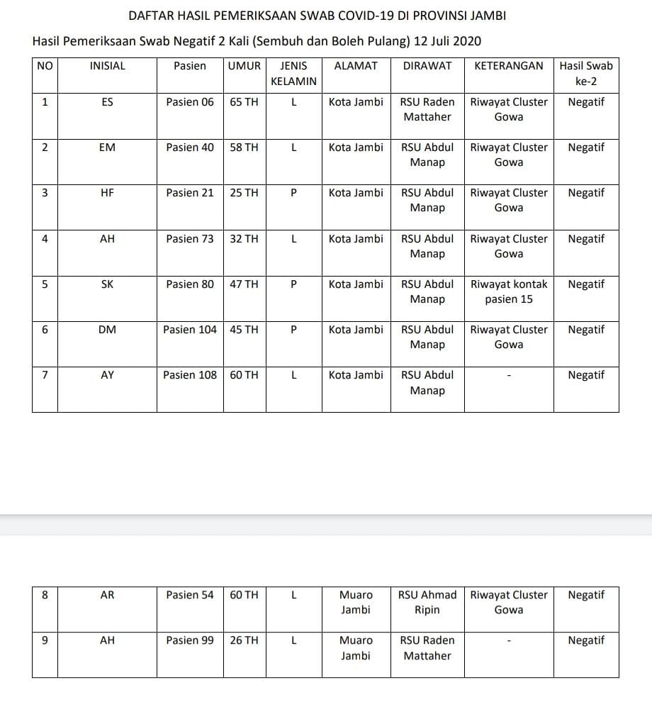 JAMBIUPDATE.CO, JAMBI - Juru bicara gugus tugas Covid19 Provinsi Jambi Johansyah mengumumkan 9 pasien sembuh corona hari ini (12/7). Sembuh terbanyak berasal dari Kota Jambi 7 orang dan sisanya dari Kabupaten Muaro Jambi.