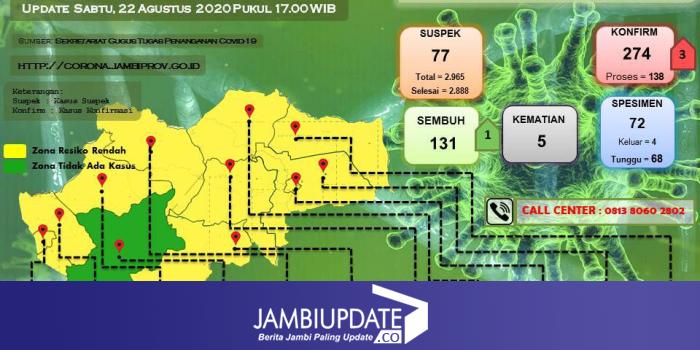 JAMBIUPDATE.CO, JAMBI - Juru bicara gugus tugas Covid19 Provinsi Jambi mengumumkan tiga kasus positif baru pada hari ini (22/8). Kasus ini berasal dari Kota Jambi, Muaro Jambi dan Tanjab barat.