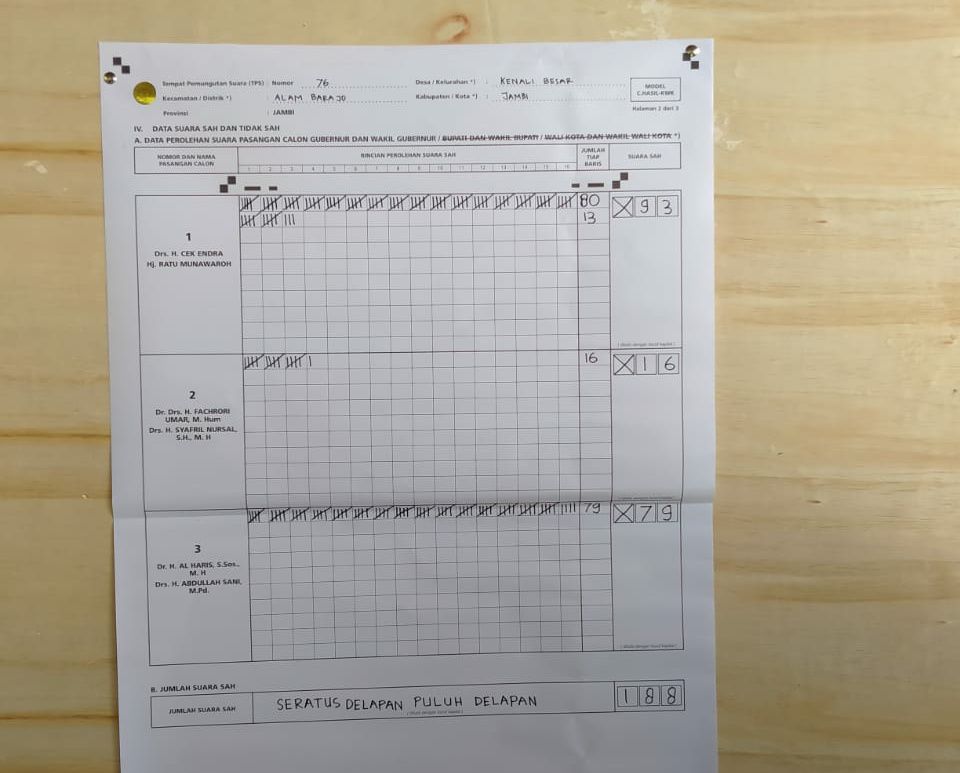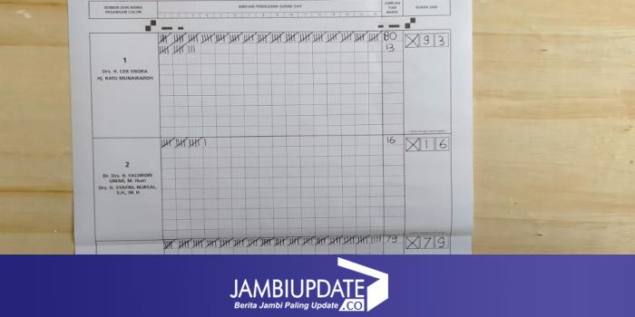 Berdasarkan informasi hasil penghitungan suara yang diterima jambiupdate.co, pasangan nomor urut 1 CE-Ratu memperoleh 93 suara, disusul pasangan nomor urut 3 Haris-Sani memperoleh 79 suara.