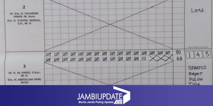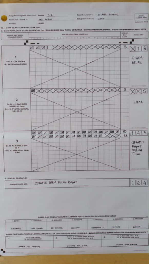 Dari hasil perhitungan sementara, Di TPS 16 kelurahan Talang Bakung kecamatan Pall Merah Tempat Calon Wakil Gubernur Jambi nomor urut 3 Abdulah Sani mengunakan hak suaranya Pasang Harus Sani memperoleh suara 143 suara dari total mata pilih 164.