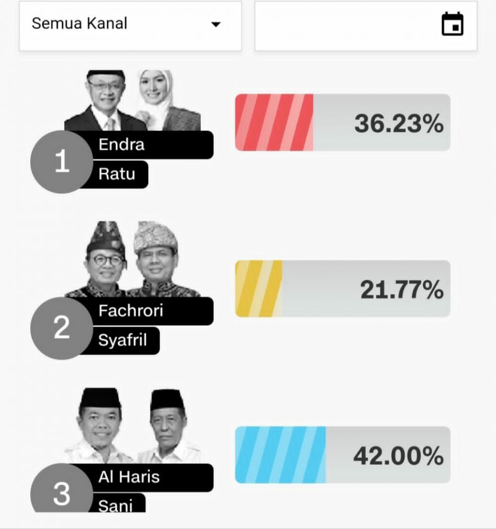 Berdasarkan hasil hitung cepat (Quick Count), perolehan suara Calon Gubernur dan Calon Wakil Gubernur Jambi oleh Lingkaran Survei Indonesia (LSI) per pukul 14:37 WIB dengan suara masuk 38,77 persen, pasangan Haris-Sani unggul 42,00 persen.