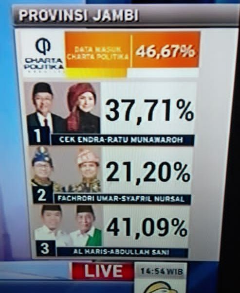 Sementara hasil quick count Charta Politika, suara masuk 58 persen, pasangan Haris-Sani unggul 40,25 persen.