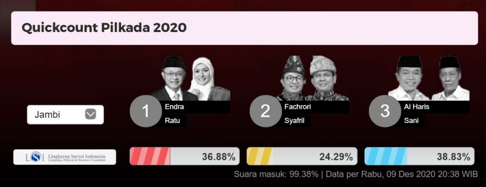 Data terakhir quick count LSI per pukul 20.35 WIB, suara masuk sudah mencapai 99,38 persen. Al Haris memeroleh 38,83 persen, CE-Ratu 36,88 persen dan FU-Syafril 24,29 persen.