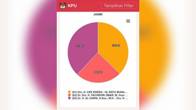 JAMBIUPDATE.CO, JAMBI- Real count C 1 Pilgub Jambi 2020 KPU Provinsi Jambi semakin dinamis. Suara masuk untuk tiga pasangan calon gubernur makin mengalami perubahan signifikan.