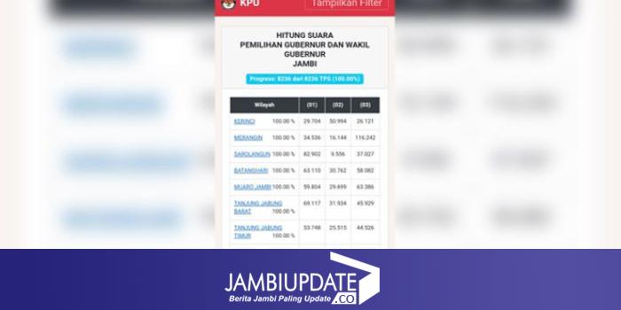 JAMBIUPDATE.CO, MUARA BUNGO - Tabulasi suara yang di unggah dari data formulir model C.Hasil-KWK melalui Sirekap KPU untuk Pilkada Bupati dan Wakil Bupati Kabupaten Bungo rampung 100 persen.
