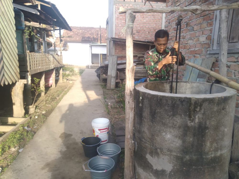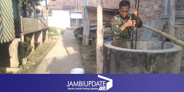 JAMBIUPDATE.CO, JAMBI - Satgas TMMD ke 110 Kodim 0415/Batanghari bantu warga Desa Sungaiterap dalam menimba air di sumur orang tua asuhnya, yakni Sarinah, yang tinggal di kawasan RT 06, Sabtu (6/3/2021).