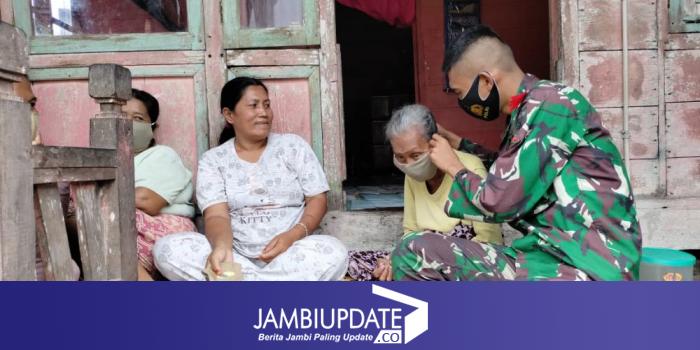 JAMBIUPDATE.CO, JAMBI - Satgas TMMD ke 110 Kodim 0415/Batanghari dor to dor dalam membagilan masker ke warga Desa Sungaiterap, Minggu (7/3/2021).