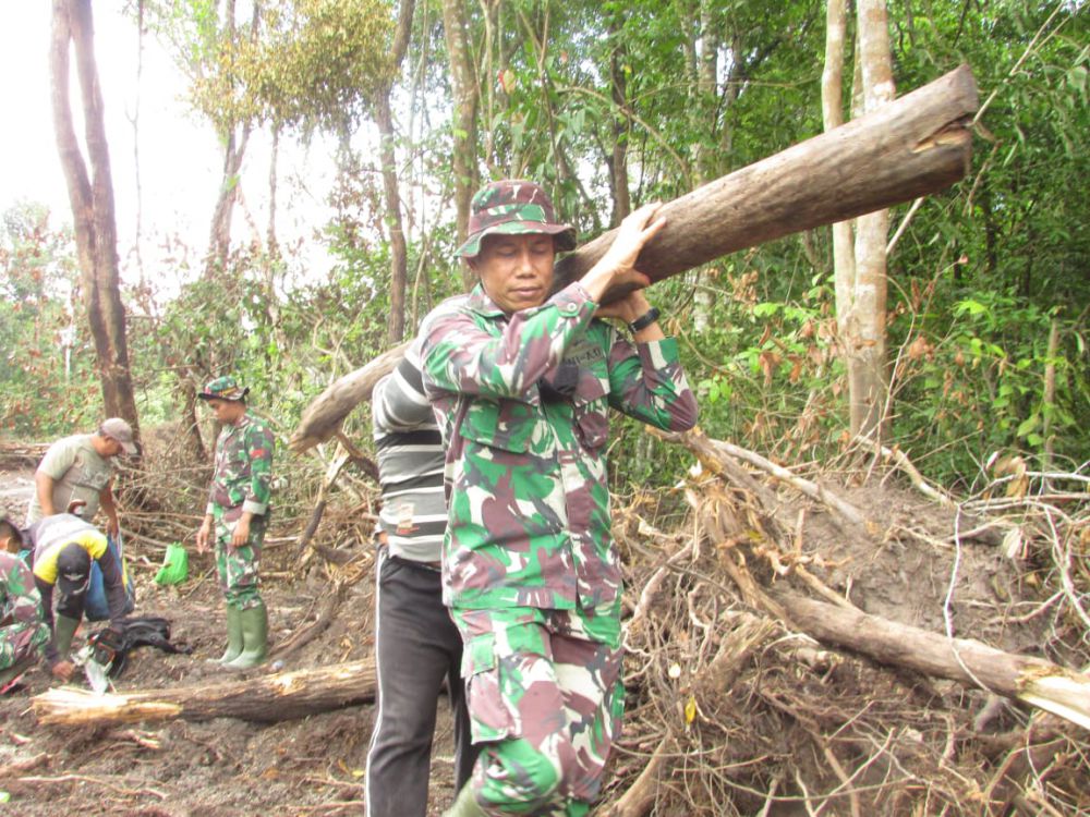 Sebanyak 10 batang pohon dengan ukuran panjang 5 meter yang tumbang saat penerobosan lahan, harus disusun di depan bulldozer itu, agar bisa keluar di tengah kanal.