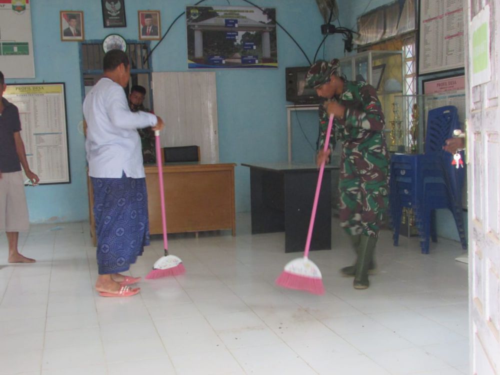 JAMBIUPDATE.CO, JAMBI - Perangkat Desa Sungaiterap dan Satgas TMMD ke 110 Kodim 0415/Batanghari bergotong royong membersihkan kantor Desa, lantaran akan digelar penyuluhan dengan tema Kamtibmas Bahaya Teroris dan paham radikalisme, Senin (8/3/2021).