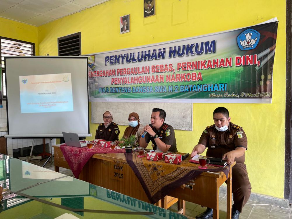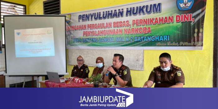 JAMBIUPDATE.CO,BATANGHARI - Melalui kegiatan "Jaksa Masuk Sekolah" Cabang Negeri Batanghari di Muara Tembesi memberikan penyuluhan / penerangan hukum mengenai pencegahan pergaulan bebas, pernikahan dini, dan penyalahgunaan narkoba. Kegiatan tersebut berlangsung di SMPN 1 Batanghari, dan SMA N 2 Batanghari.
