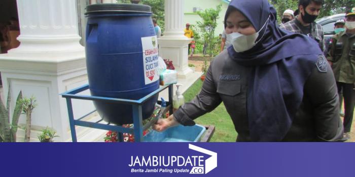 Saat tiba, Bupati Muarojambi, Hj Masnah Busroh langsung mencuci tangan yang disediakan di Rumah Kades Sungaiterap.