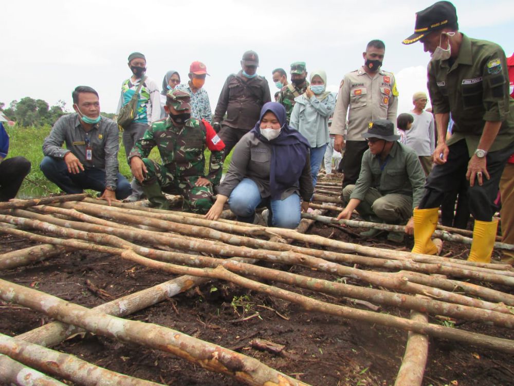 JAMBIUPDATE.CO, JAMBI - Dandim 0415/Batanghari, Kolonel J Hadiyanto dan Bupati Muarojambi, Hj Masnah Busro, bantu Satgas TMMD ke 110 dalam pemasangan galar, di Desa Sungaiterap, Sabtu (13/3/2021).