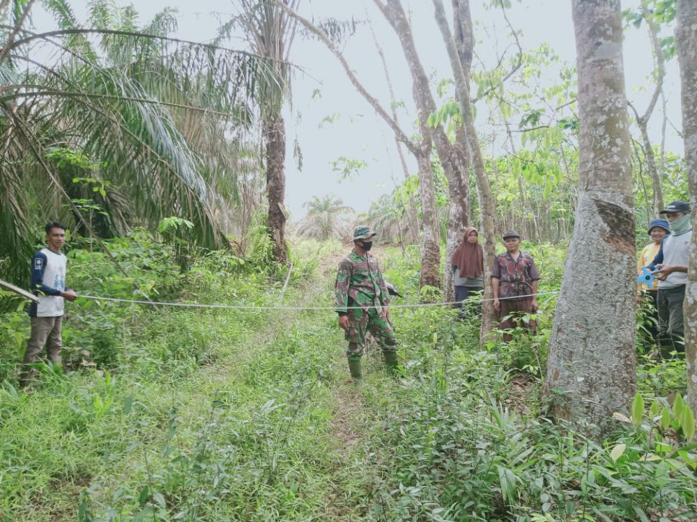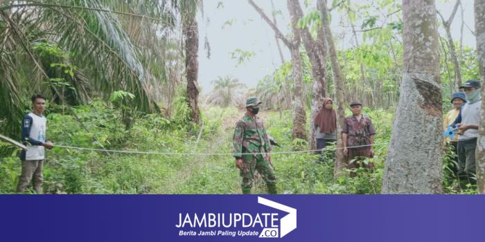 JAMBIUPDATE.CO, JAMBI - Agar tidak terjadi kesalahan dalam pembuatan jalan, Satgas TMMD ke 110 Kodim 0415/Batanghari, bersama warga Mekarjaya, melakukan pengukuran lahan untuk diterobos, Minggu (14/3/2021) pagi.