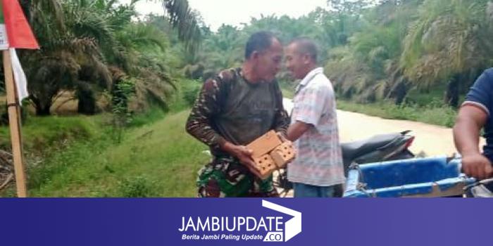 Pantauan dilapangan, tampak Serma Ahmda Jufri mengambil batu bata itu dan menyusuunya dalam ambung yang dibawa Wakil Badan Permusyawaratan Desa (BPD) Sungaiterap, Zuadi.