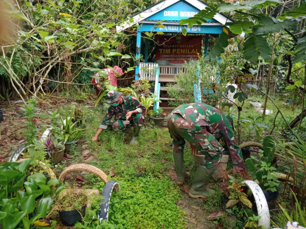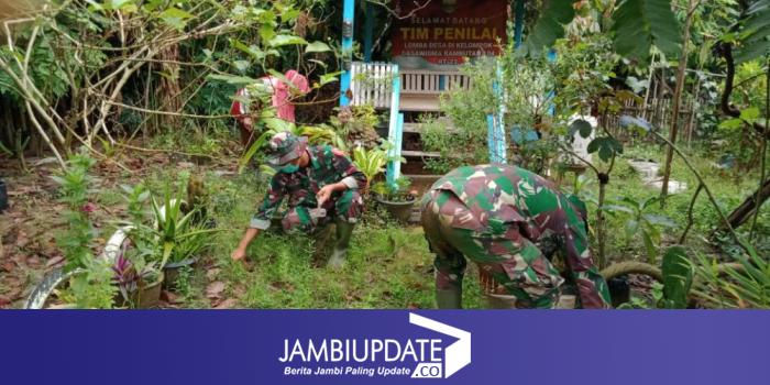 JAMBIUPDATE.CO, JAMBI - Satgas TMMD ke 110 Kodim 0415/Batanghari di Desa Mekarjaya, membantu ibu-ibu dalam membersihkan taman PKK, Kamis (18/3/2021) pagi.