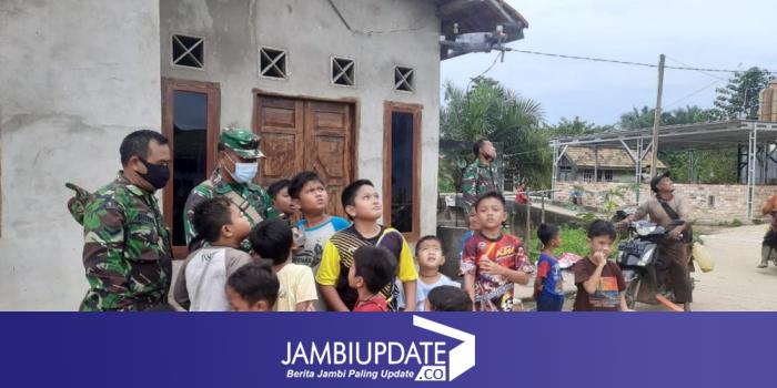 JAMBIUPDATE.CO, JAMBI - Selain keahlian di angkatan darat, Dan SSK, Kapten Inf Rilman, mempertunjukkan keahlianya dalam menerbangkan drone, ke anak-anak Desa Sungaiterap, dalam program TMMD ke 110 Kodim 0415/Batanghari, Minggu (21/3/2021) pagi.
