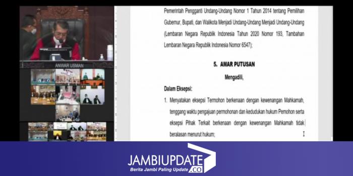 JAMBIUPDATE.CO, JAMBI- Mahkamah Konstitusi (MK) akhirnya membacakan putusan terkait sengketa Pilgub Jambi atas gugatan yang dilayangkan pasangan Cek Endra-Ratu Munawaroh.