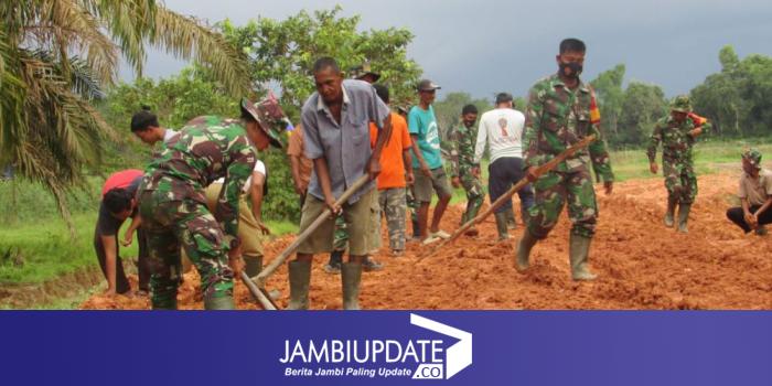 JAMBIUPDATE.CO, JAMBI - Satgas TMMD ke 110 Kodim 0415/Batanghari dan warga Desa Sungaiterap, bergotong royong meratakan jalan yang sudah ditimbun pada galar jalan penghubung dua desa, Kamis (25/3/2021).