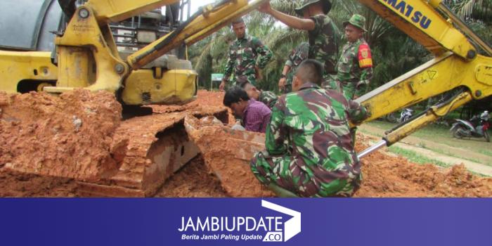 JAMBIUPDATE.CO, JAMBI - Lagi, Satgas TMMD ke 110 Kodim 0415/Batanghari bersama warga Desa Sungaiterap, pasang rantai roda yang terlepas dari excavator saat digunakan untuk meratakan jalan, Kamis (25/3/2021).